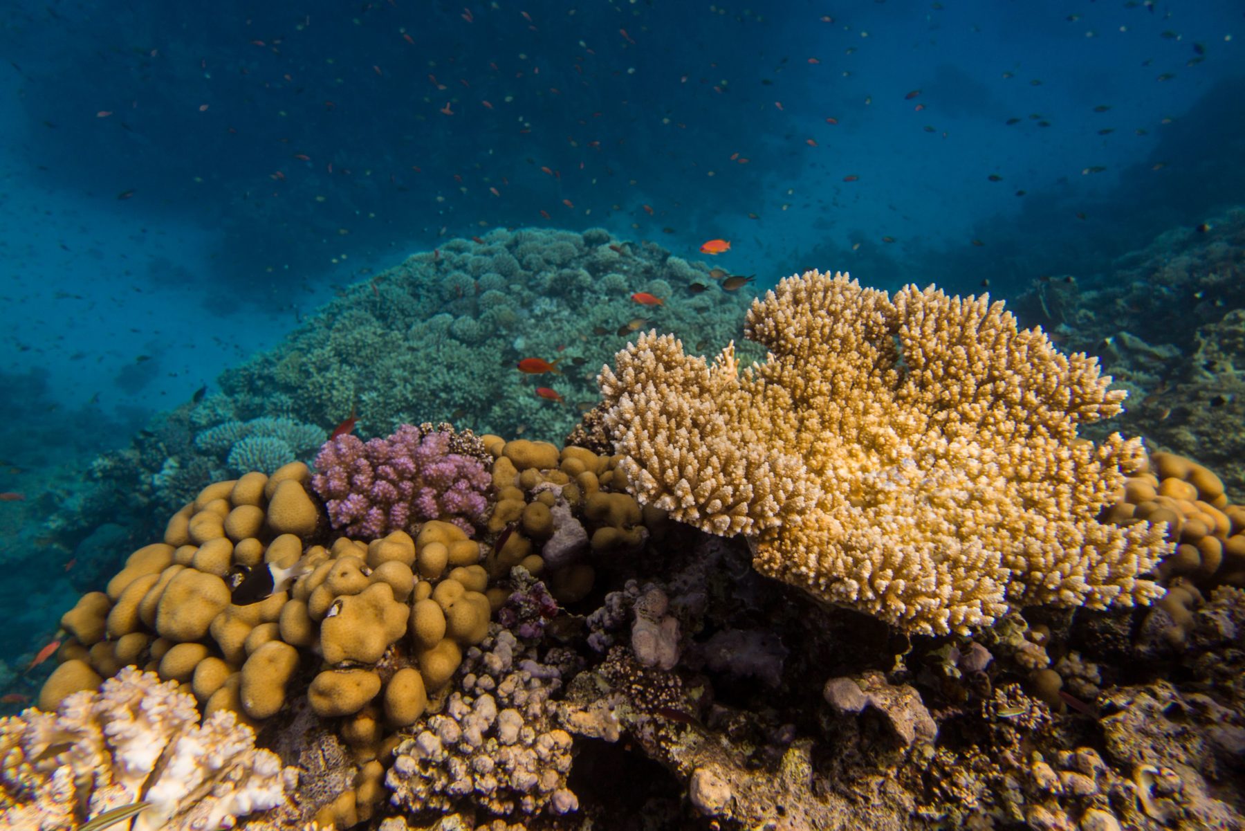 The reef is impressive with its soft corals and sea fans and with a few isolated table corals.
